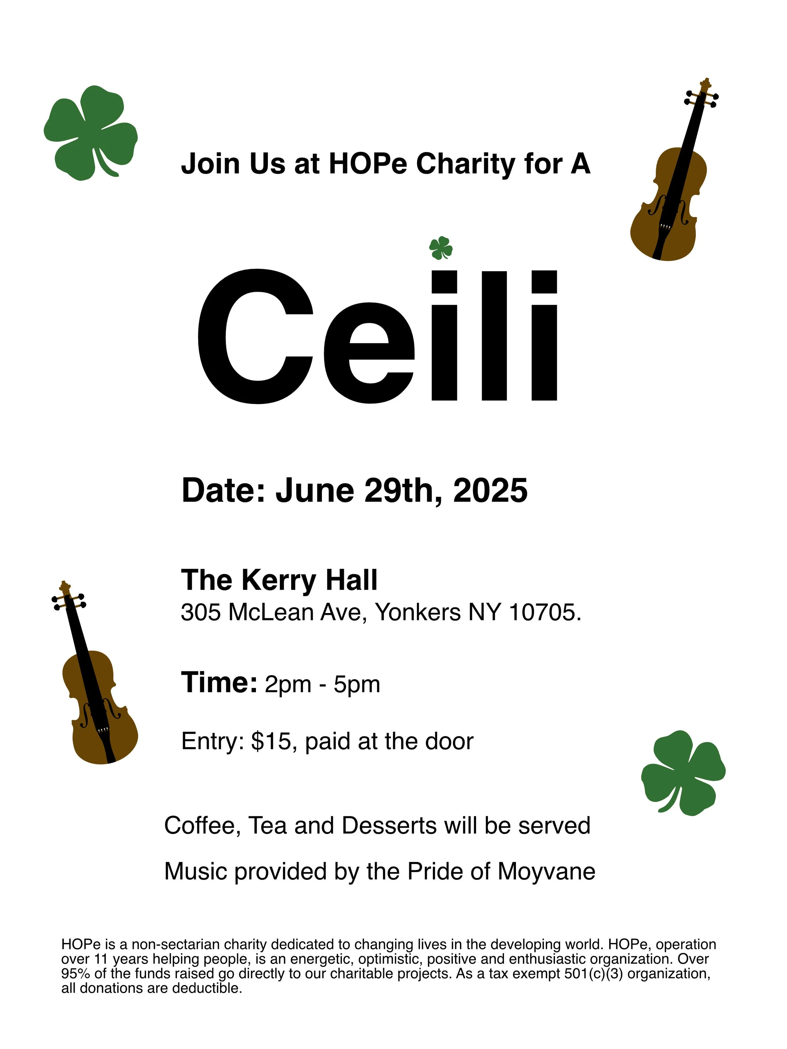 Join HOPe for their annual New Years Day Mixed Ceili to help raise funds for HOPe Charity. A fun day of dancing to live music by John Nolan, Sean Fleming and friends.